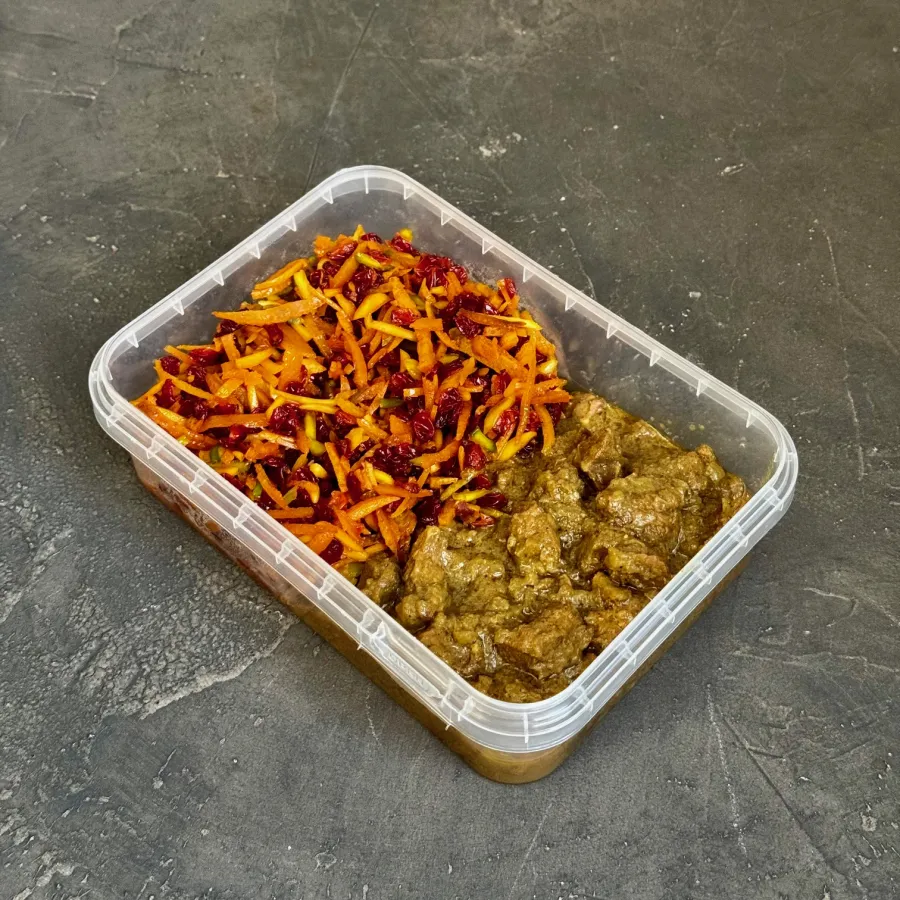 شامل: زرشک و خلال پسته و بادام و گلاب و زعفران و گوشت قیمه ای گوساله