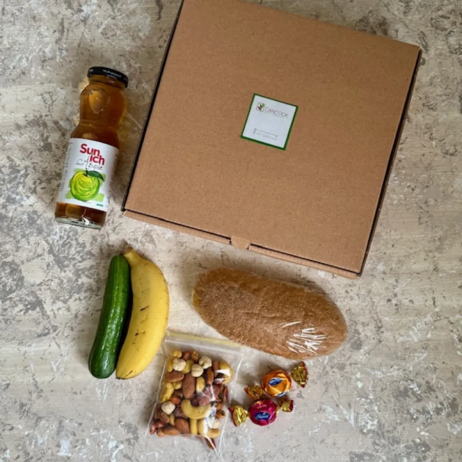 شامل :یک عدد موز ، یک عدد خیار ، یک عدد ساندویچ مرغ و جعفری ، یک عدد آبمیوه شیشه ای ، دو عدد تافی مغزدار و 50 گرم آجیل