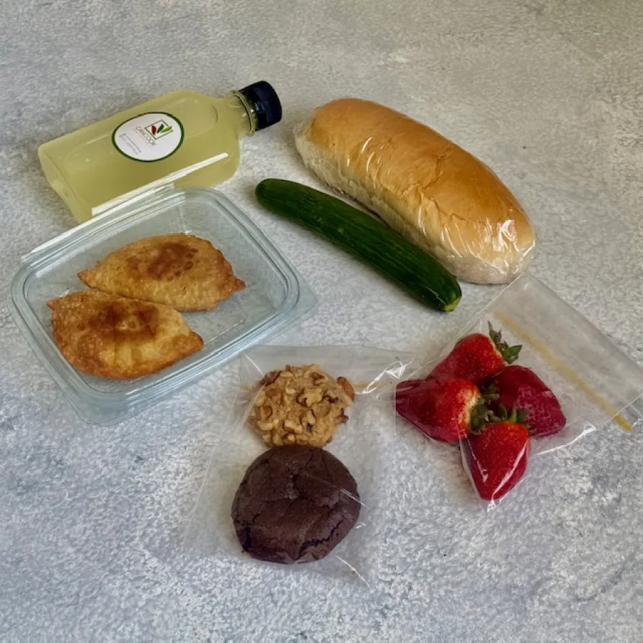 شامل : یک عدد آبمیوه ،2 عدد پیراشکی مرغ و پستو ،یک عدد ساندویچ کوکو سبزی،یک عدد خیار ، دو عدد کوکی و چهار عدد توت فرنگی